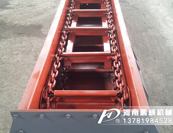 刮板輸送機(jī)的工作原理是,將敞開的溜槽,作為煤炭、矸石或物料等的承受件,將刮板固定在鏈條上(組成刮板鏈),作為牽引構(gòu)件。當(dāng)機(jī)頭傳動(dòng)部啟動(dòng)后,帶動(dòng)機(jī)頭軸上的鏈輪旋轉(zhuǎn),使刮板鏈循環(huán)運(yùn)行帶動(dòng)物料沿著溜槽移動(dòng),直至到機(jī)頭部卸載。刮板鏈繞過鏈輪作無級閉合循環(huán)運(yùn)行,完成物料的輸送。