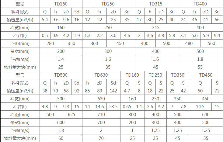 TD型斗式提升機是膠帶提升機,本公司產(chǎn)品根據(jù)斗子寬度可分四個型號:TD160、TD250、TD350、TD450,可采用深斗淺斗滿足不同的生產(chǎn)需求,最大能輸送69.6m3/h物料,提升高度為4-30m。傳動裝置TD型斗提升機的傳動裝置有兩種形式分別配有YZ型減速器ZQ(或YY)型減速器。YZ型軸減速器直接裝在主軸軸頭上,省去了傳動平臺、聯(lián)軸器等,使結(jié)構(gòu)緊湊、重量輕,而且其內(nèi)部帶有異型輥逆止器,逆止可靠。該減速器噪音低,運轉(zhuǎn)平穩(wěn),并隨主軸浮動,可消除安裝應力。TD型斗式提升機的牽引件為橡膠帶,料斗以一定的間隔固定在橡膠帶上,橡膠帶分別繞過提升機頭部和底部的滾筒,構(gòu)成具有上升有載分支和下降無載分支的閉合環(huán)形系統(tǒng);工作時,布置在提升機頭部的驅(qū)動裝置通過頭部滾筒將動力傳給橡膠帶和料斗,物料從提升機底部的進料口進入料斗,料斗將物料提升至頭部的卸料口,在離心力和重力的共同作用下,料斗中的物料經(jīng)卸料口卸出。