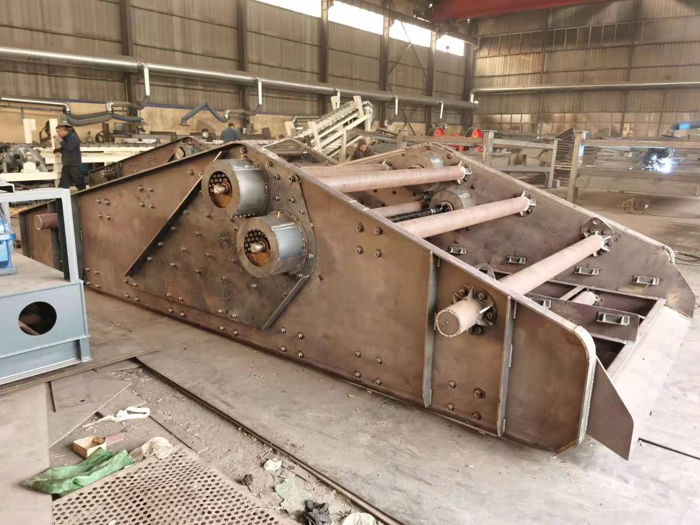 高頻振動(dòng)脫水篩由兩臺(tái)電機(jī)外拖動(dòng)作反方向同自同步旋轉(zhuǎn),采用雙電機(jī)驅(qū)動(dòng)自同步技術(shù),激振器通過繞性聯(lián)軸器拖動(dòng),兩組激振器作同步反向旋轉(zhuǎn)時(shí),其偏心塊所產(chǎn)生的激振力在平行于電機(jī)軸線的方向相互抵消,在垂直于電機(jī)軸的方向疊為一合力,從而形成單一的沿振動(dòng)方向的激振力,其兩軸相對(duì)于篩面有一傾角,在激振力作用下使篩箱做往復(fù)直線運(yùn)動(dòng),物料在篩面上被拋起跳躍向前作直線運(yùn)動(dòng),同時(shí)V型設(shè)計(jì)的篩面結(jié)構(gòu)更佳的實(shí)現(xiàn)脫水效果。